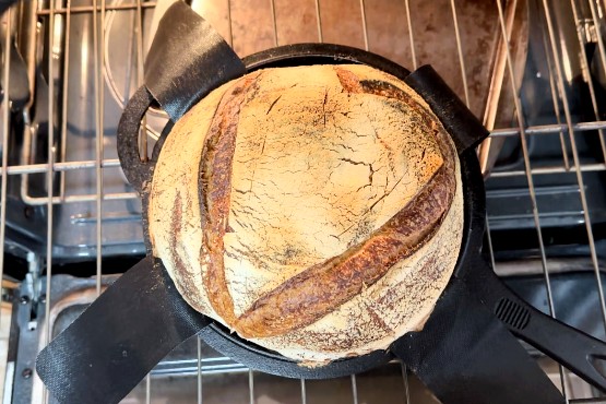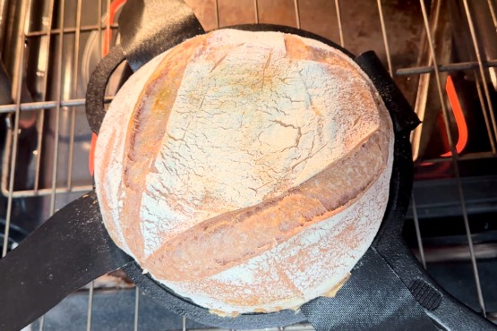 11. Remove the lid and bake for 25 more minutes. To prevent the bottom of your bread from burning, place a baking tray on the rack beneath your Dutch oven.
