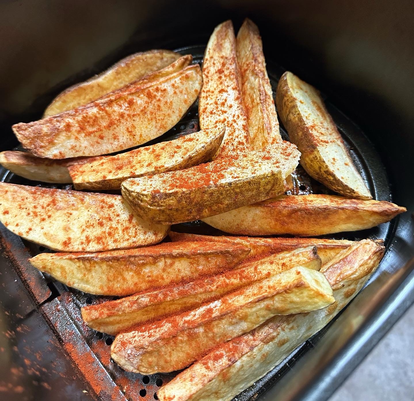 Extiende las papas en una sola capa dentro de la cesta de la freidora. Cocina unos 20 minutos, o hasta que estén suaves por dentro y doradas por fuera, con las orillas crujientes.